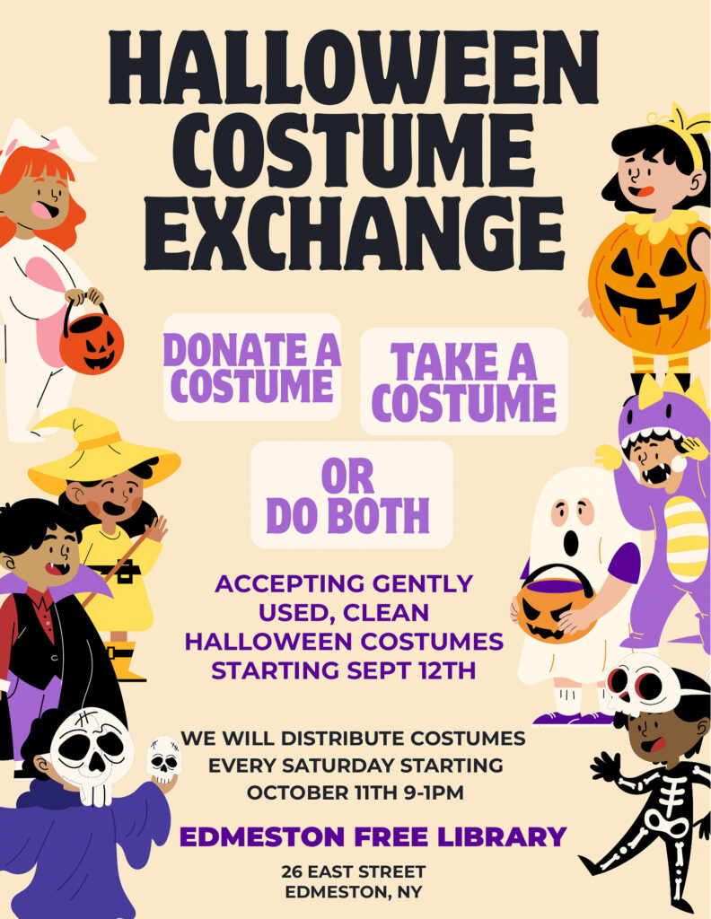 As part of The Great Give Back, a community service initiative for public libraries in New York State, we will be accepting donations for gently used, clean Halloween costumes starting Friday September 12th until October 10th. You can drop them off during the library’s open hours (T-Fri 12-5, Sat 9-1).