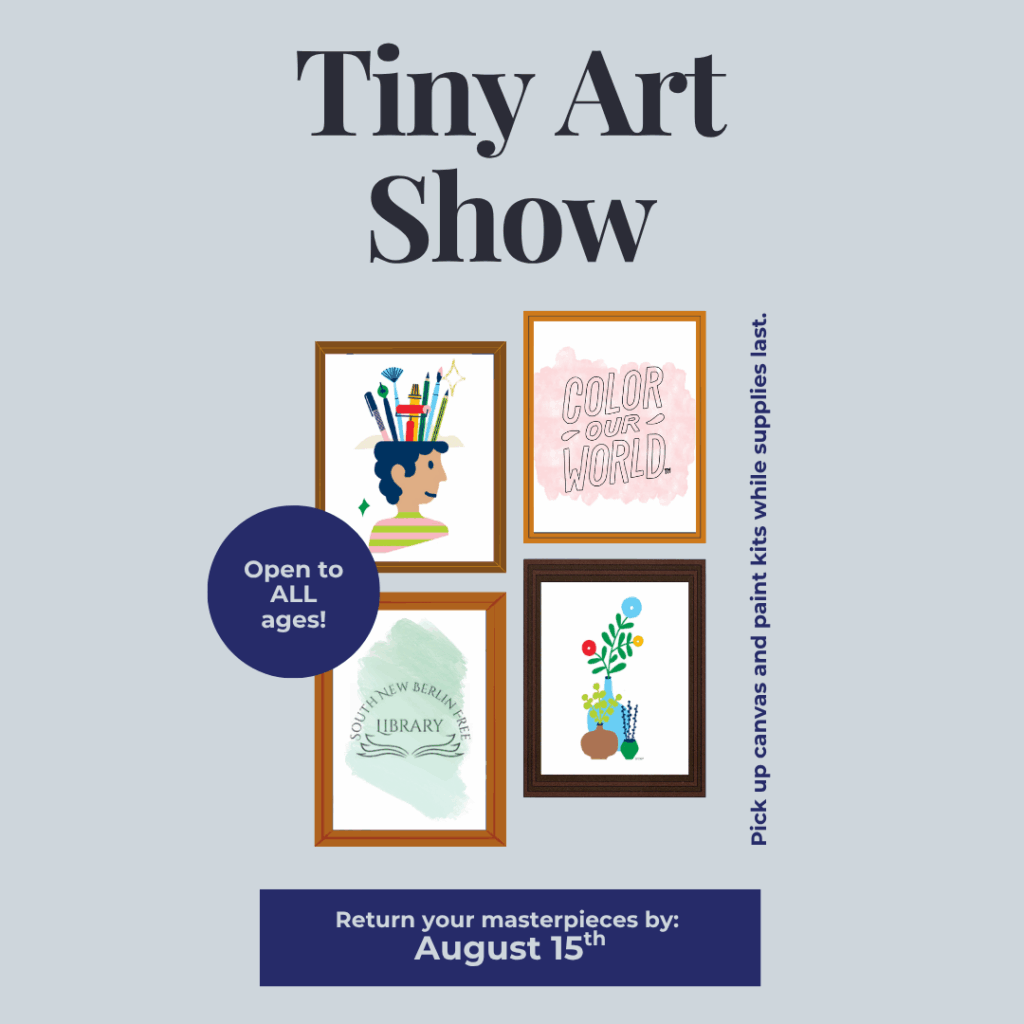 Calling artists of all ages and all skill levels! Join our Tiny Art Show, where your creativity will shine—mini style. Pick up a free mini canvas and paint kit at the library, and create your masterpiece in any medium: paint, marker, crayon, collage, fabric, yarn, … Continue reading Tiny Art Show