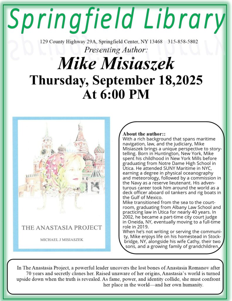 Springfield Library is accepting applications for the position of Library Manager until Oct. 1, 2025. Please send resumes to : Springfield Library Board, PO Box 142, Springfield Center, NY 13468
