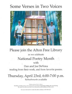 We are very pleased to welcome Dan & Joe DeVona to the Afton Free Library on Thursday evening, April 23rd, from 6-7pm as they present an evening of Original and Favorite Poems to celebrate National Poetry Month!