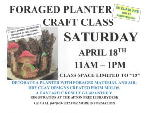 Join us on Saturday, April 18th, from 11am-1pm and Decorate a Planter with Foraged Materials and Air-Dry Clay designs created from molds. Class Space is Limited to 15. Fun and Fantastic Results Guaranteed!