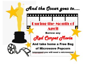 Borrow a Movie that has won or been nominated for an Oscar during the month of April and take home a Free Bag of (unpopped) Microwave Popcorn!