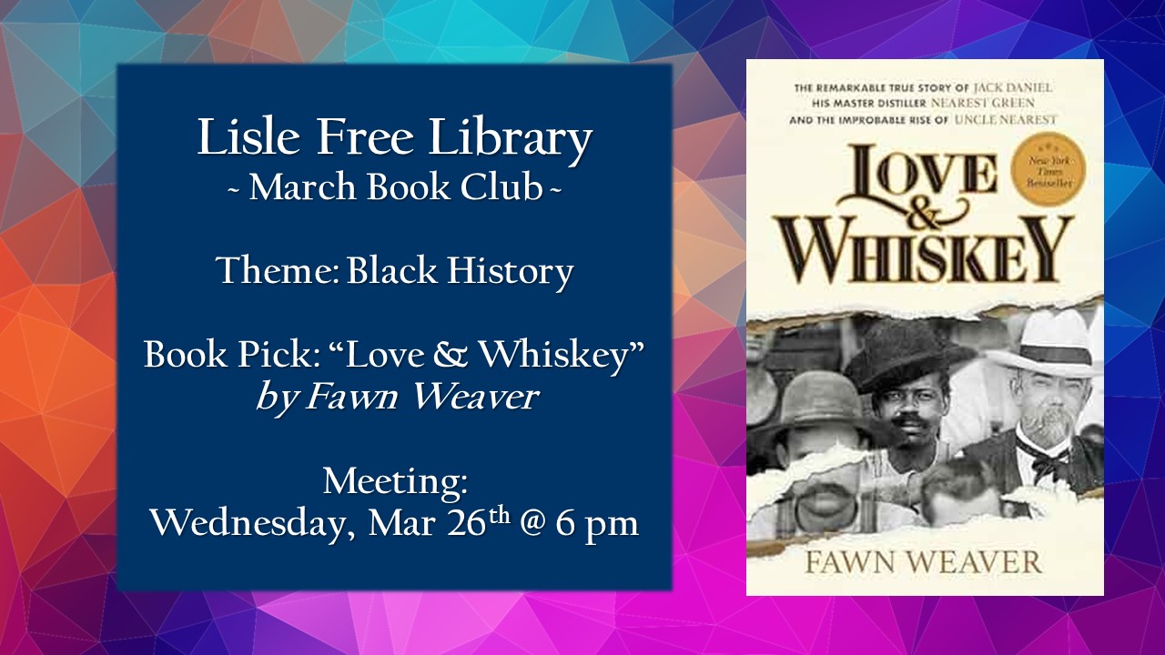 March is Black Voices Month! All readers are welcome to join our informal monthly book club meeting on Wednesday, 3/26 @ 6pm. This month’s book suggestion is “Love & Whiskey” by Fawn Weaver. As always, there is no required reading to attend the meeting. Please