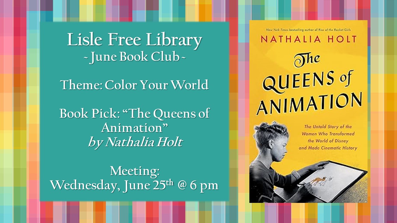 June kicks off our Summer Reading Theme – Color Your World with Art! All readers are welcome to join our informal monthly book club meeting on Wednesday, 6/25 @ 6pm. This month’s book suggestion is “The Queens of Animation” by Nathalia Holt. As always, there