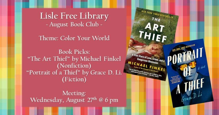 August is our third and final installment of our Summer Reading Theme – Color Your World with Art!All readers are welcome to join our informal monthly book club meeting on Wednesday, 8/27 @ 6pm. This month’s book suggestions are “The Art Thief” by Michael Finkel