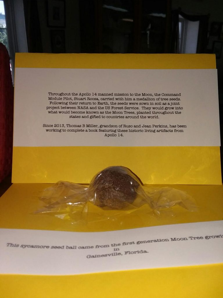 Come in and check out the Apollo 11 display at the library. The NASA Archives, First on the Moon, Moon Tree Sycamore seed ball, and Apollo 11 model (built by Thomas Miller) was donated to the library by Andrea Miller and Donald Perkins in honor of their parents, Jean and Ruso Perkins.