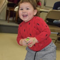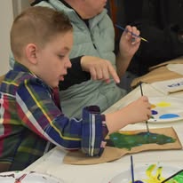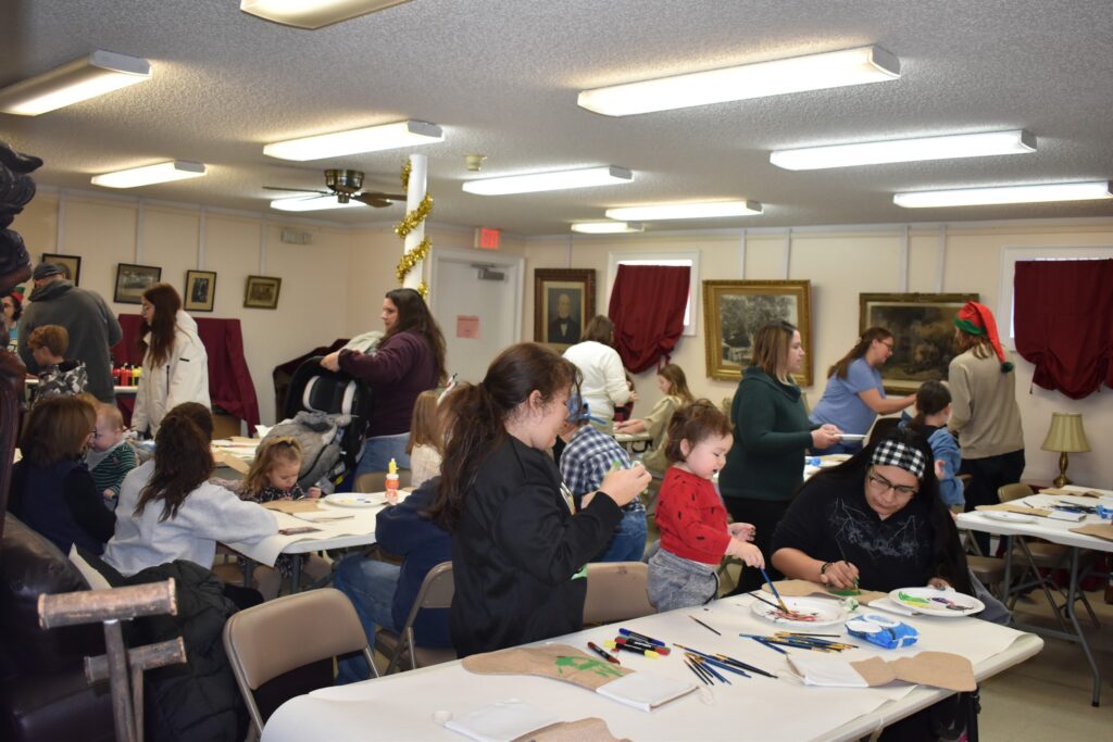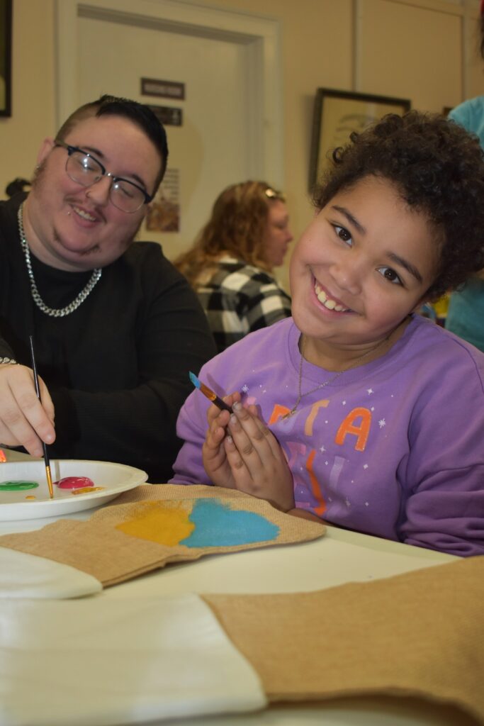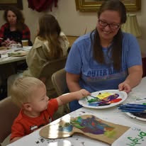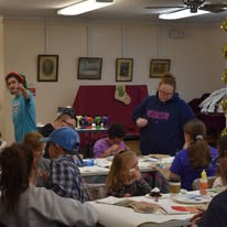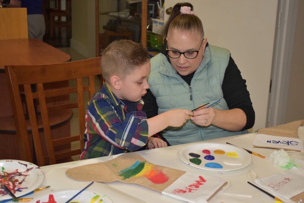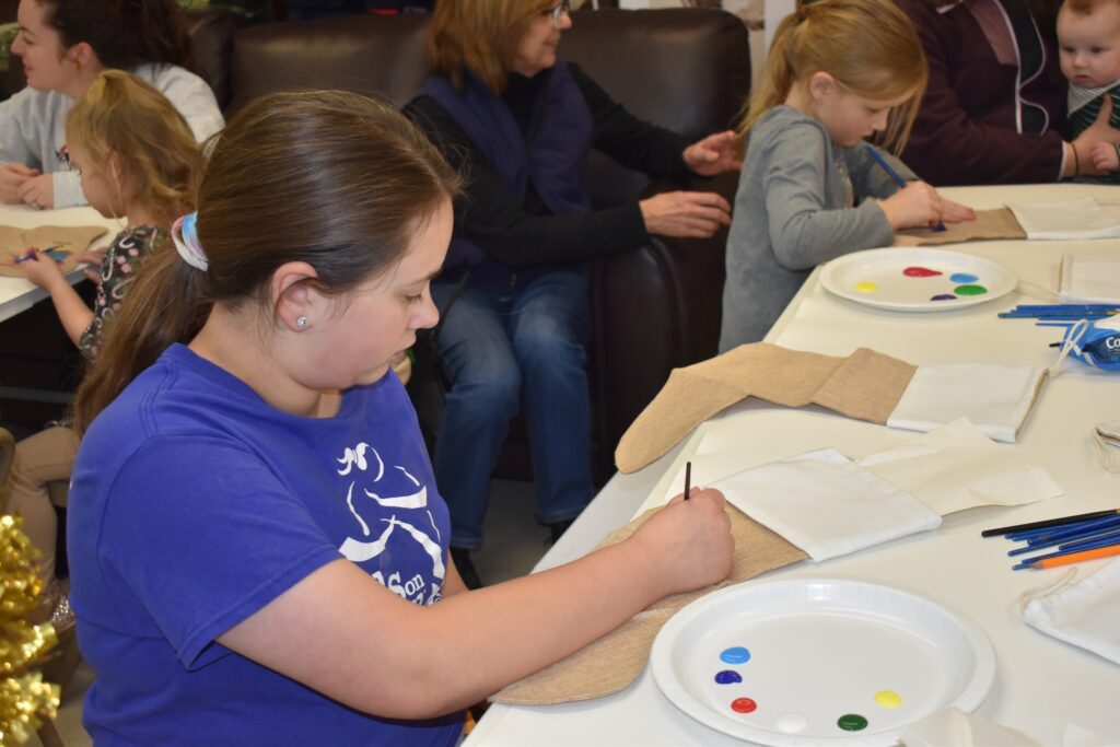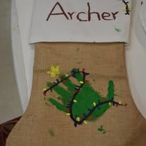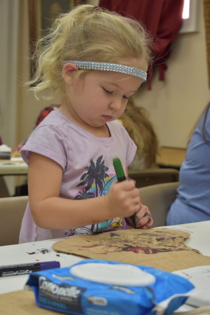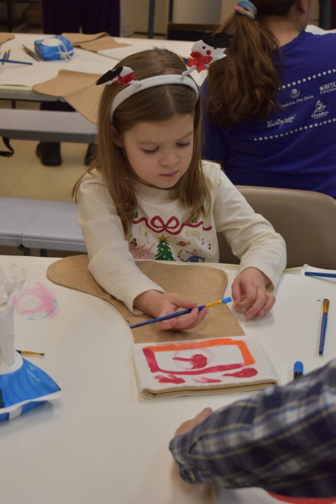 Participating children painted Christmas stocking. The children painted the palms of their hands green and pressed them to the stocking to create the “branches” of a Christmas tree and then painting decorations on their trees. Finally, the children painted their names on the cuffs of the stockings. Fabric paint was used to paint the stocking to ensure that they would last through potential washing and serve as a childhood keepsake for years to come.